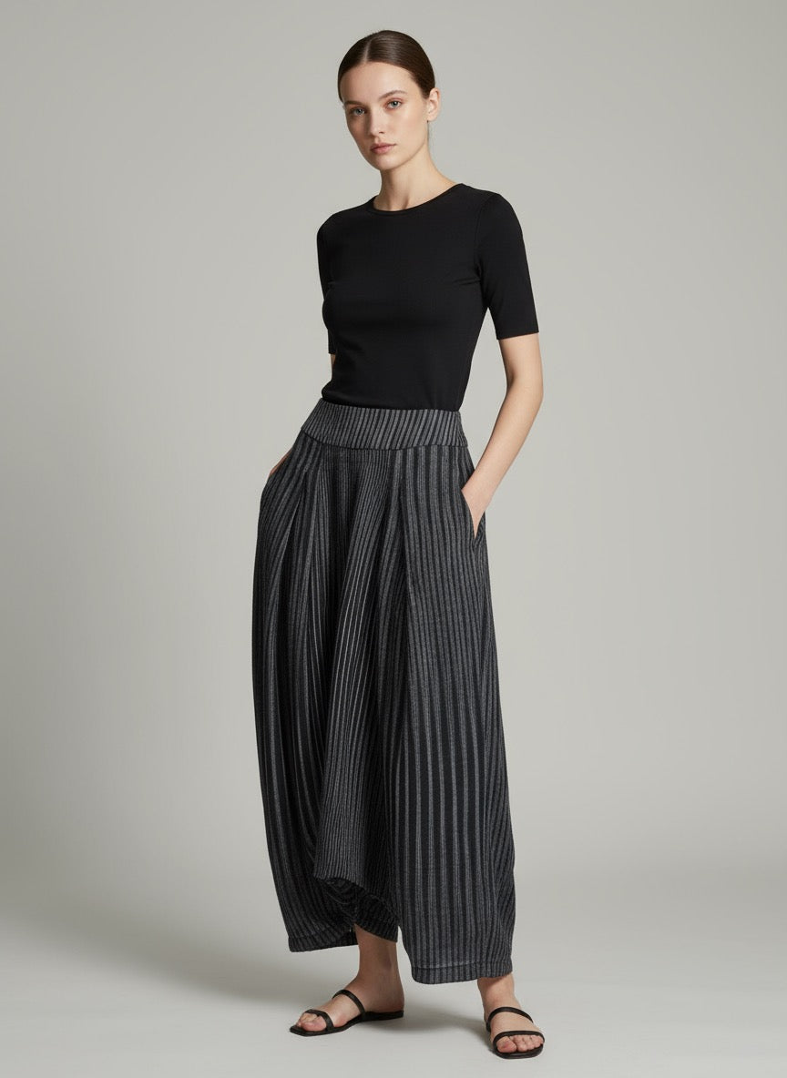 Step into a look that blends chic sophistication with everyday ease. This ensemble features a classic black fitted tee paired with wide-legged, striped palazzo pants—perfect for making a statement while staying comfortable all day. Ideal for work or weekend outings, its versatile style invites you to move confidently through every moment.